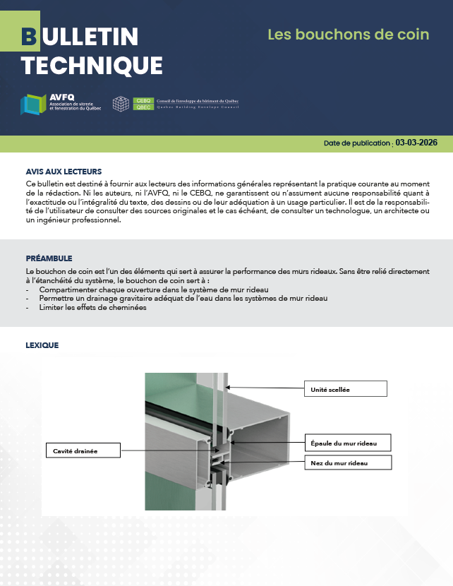 Nouvelles exigences d’efficacité énergétique des murs-rideaux (CNEB 2015 Modifié Qc) Principed’assemblagedes murs rideaux Panneauxtympansde parapet Installation des plaques à pression temporaires pour les systèmes de mur rideau SSG Compatibilité avecle silicone structuralet/ou d’étanchéité Lescalesd’assises Installationà bassetempérature Version téléchargeable disponible sur commande (gratuite) Contactez l’AVFQ au [email protected]