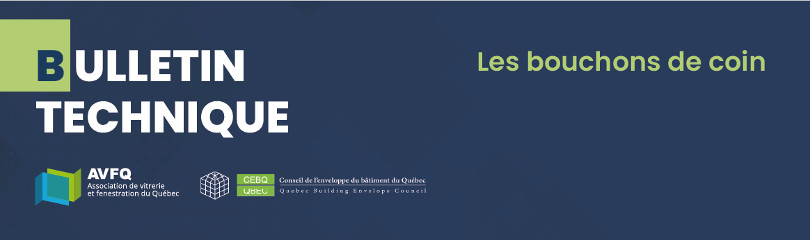 Le scellant utilisé doit être compatible aux matériaux utilisés dans la fabrication des bouchons de coin. Le scellant doit être façonné pour ne pas nuire à la circulation de l’eau dans le système de mur rideau. Les bouchons de coin doivent être d’une profondeur suffisante pour s’appuyer à la fois sur l’épaule du mur rideau et sur la plaque à pression. Les bouchons de coin permettent également de bien cibler les ouvertures qui pour-raient présenter une problématique liée à l’eau.