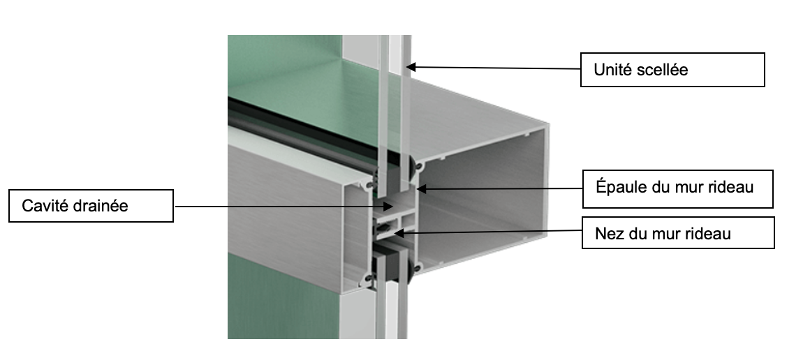 Lorsqu’un système de mur rideau est bien installé et est étanche à l’épaule, l’eau pénétrant dans le système s’évacuera de façon gravitaire. L’eau peut pénétrer de n’importe où au périmètre de l’unité scellée, mais ne peut s’évacuer que par la base. Il est donc important de s’assurer que l’eau puisse circuler au périmètre de l’unité scellée et puisse se rendre aux trous d’évacuation d’eau situés dans la plaque à pression horizontale à la base de l’unité scellée.